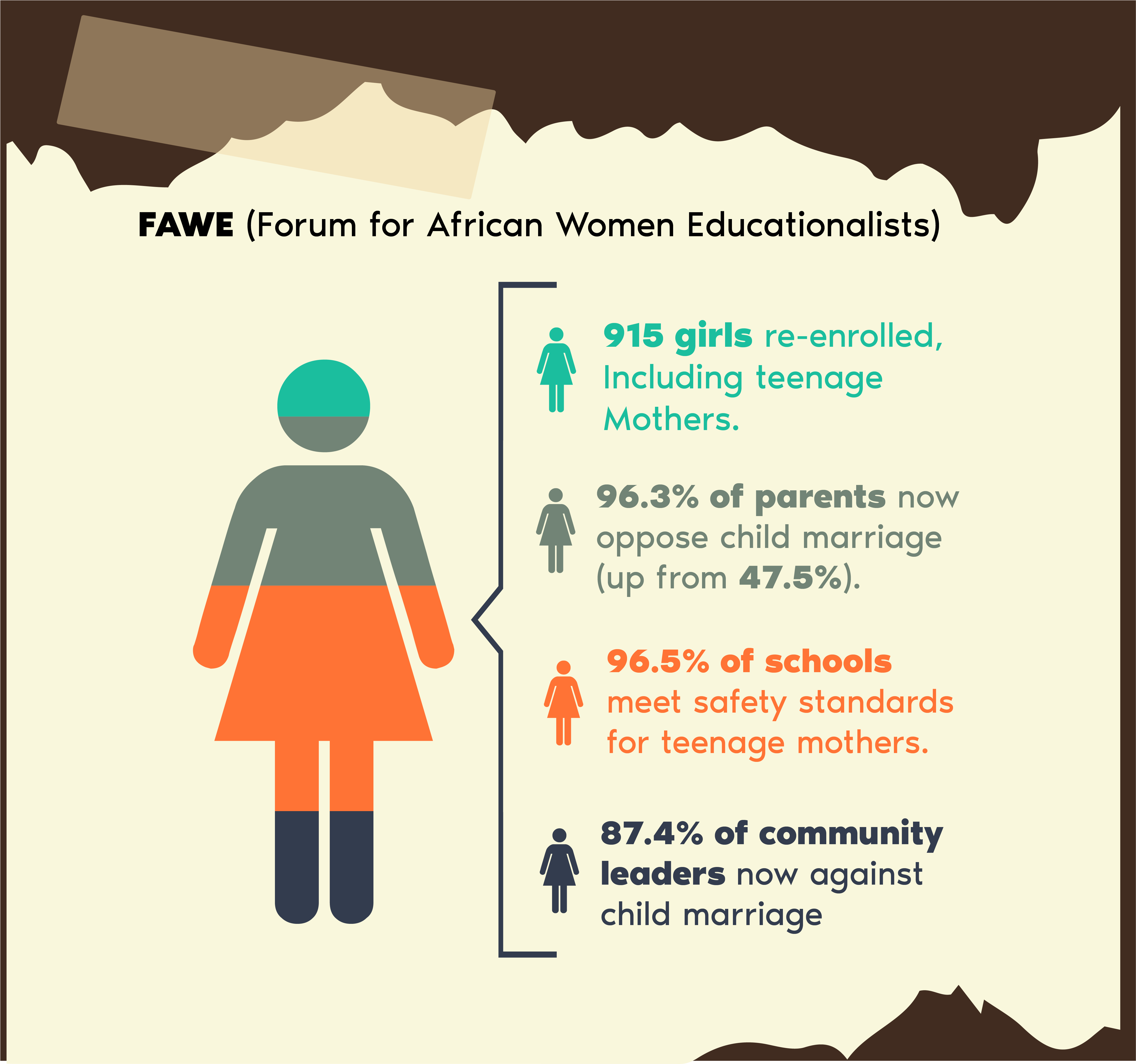 Support for Girls’ Education: FAWE’s advocacy has been instrumental in implementing re-entry guidelines for teenage mothers, helping girls return to school after dropping out due to pregnancy.